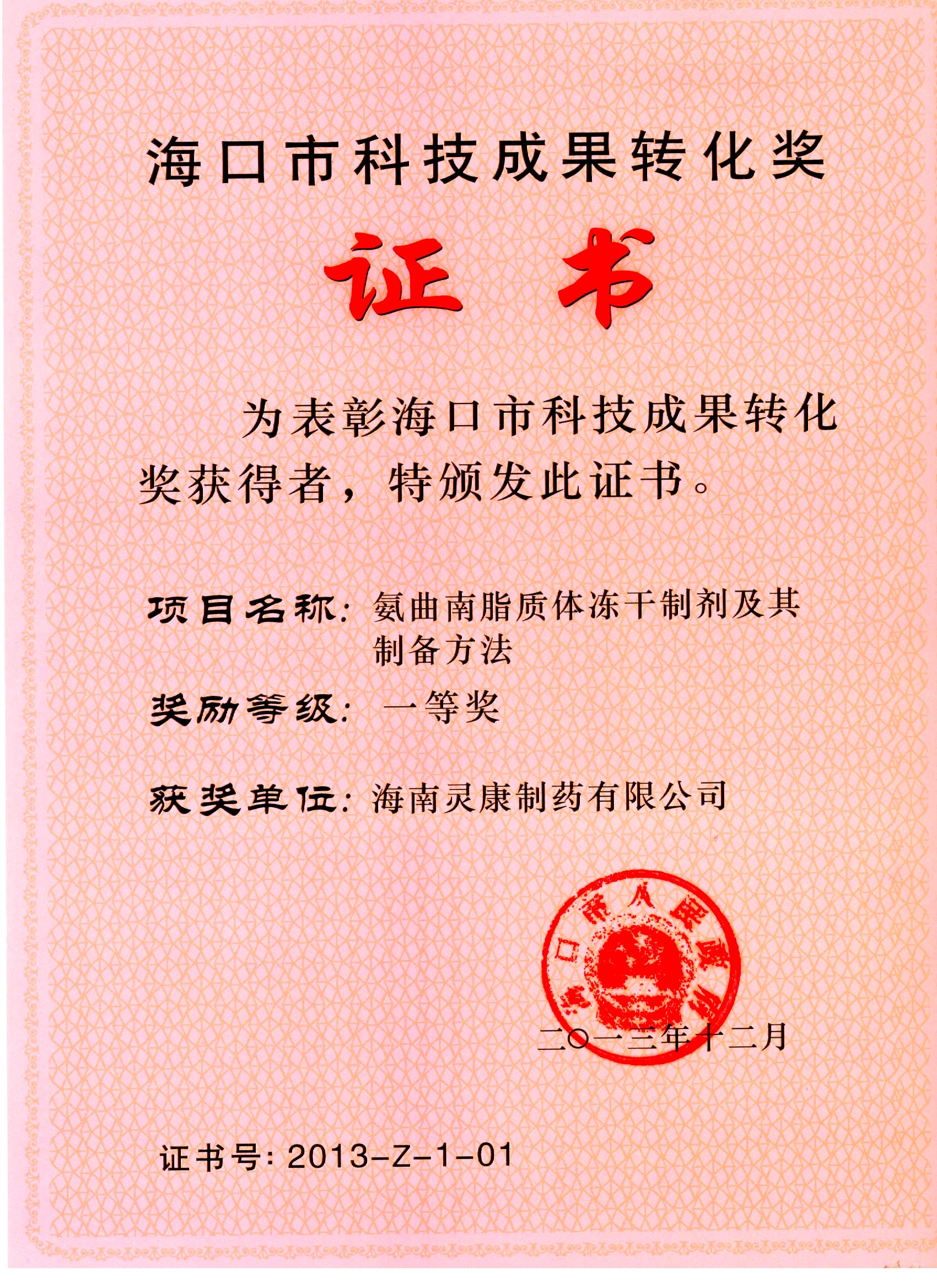 2013市科技成果轉(zhuǎn)化一等獎(jiǎng)氨曲南