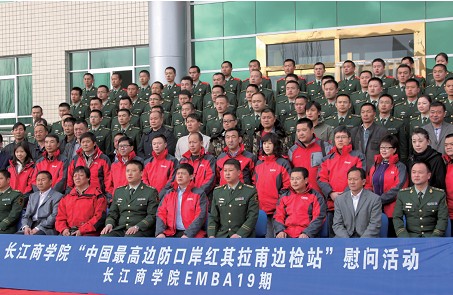 圖為長江商學(xué)院第十九期EMBA班學(xué)員與紅其拉甫邊檢站官兵合影(二排右三為陶靈萍董事長)