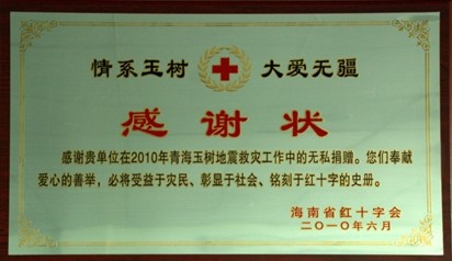 2010年4月,靈康藥業(yè)集團(tuán)股份有限公司組織員工在玉樹大地震中奔赴一線提供救援服務(wù),并啟動(dòng)緊急救援行動(dòng),第一時(shí)間向海南省紅十字會(huì)捐贈(zèng)救災(zāi)物資和善款,累計(jì)價(jià)值116萬元。