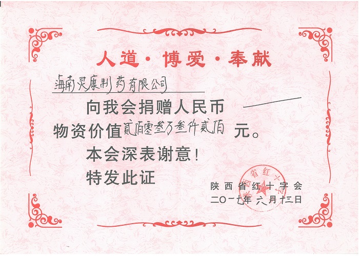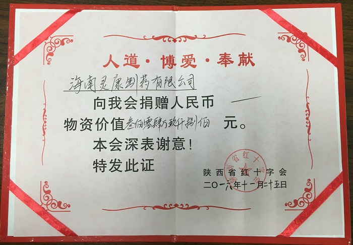 2017年6月26日,海南靈康制藥有限公司向陜西紅十字會(huì)捐贈(zèng)價(jià)值203萬元的藥品,用于陜西省部分地區(qū)貧困家庭疾病患者的免費(fèi)醫(yī)療救助。
